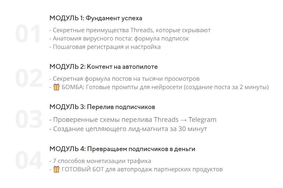 Структура курса продуманная и логичная. Здесь нет лишней информации — только то, что действительно помогает двигаться вперед. Весь курс разбит на несколько блоков, каждый из которых раскрывает определенный аспект работы с подписчиками и контентом. Это удобно, ведь можно пройти программу постепенно и не перегружаться. В курсе есть видеоуроки, практические задания и рекомендации, которые помогают закрепить знания на практике.
